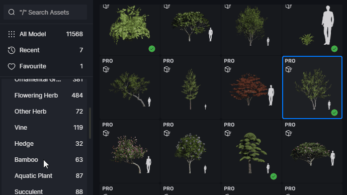 A convincing scene depends on high-quality 3D models. D5 Render features a directly accessible library with over 14,000 optimized assets. While Twinmotion’s standard vegetation can sometimes lack detail and quality, D5 Render excels with a vast and highly realistic collection of trees, plants, and grass. In terms of animated characters (over 500 in D5 Render compared to around 60 in Twinmotion), D5 Render also offers significantly more variety.